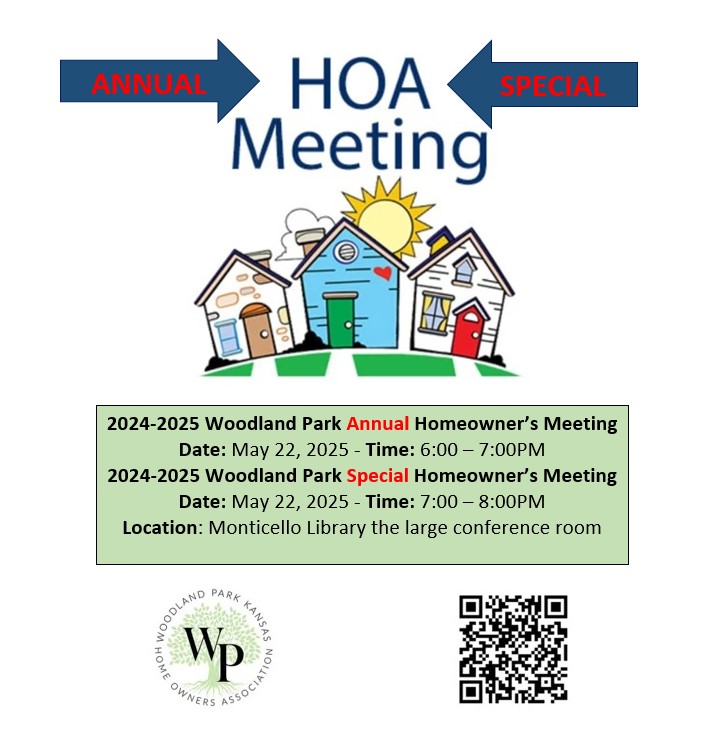 In case of inclement weather the Special Meeting to elect a Board of Directors will be moved to Wednesday June 18, 2025 at 6:30PM at the Woodland Park Homeowners Association Park